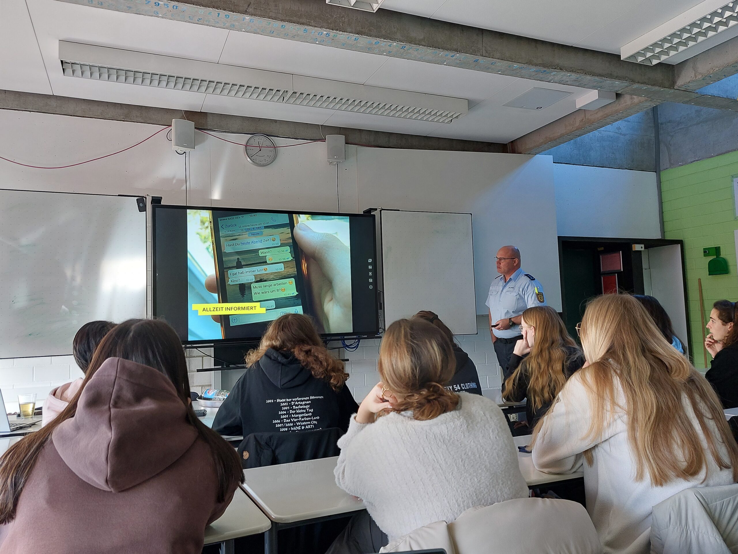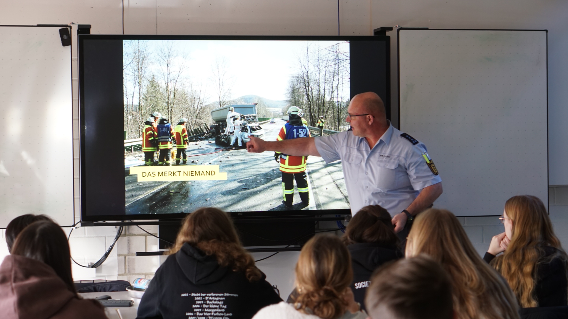 Viele der Zehntklässler:innen stehen in Kürze vor dem Erwerb eines Führerscheins (begleitetes Fahren mit 17 usw). Die junge Altersgruppe bis ca. 25 Jahren verursacht dabei erfahrungsgemäß einen überproportional großer Anteil aller Verkehrsunfälle. Um unsere Schüler:innen sicher auf ihre neue Rolle im Straßenverkehr vorzubereiten, fand am Gymnasium jetzt eine Präventionsveranstaltung, durchgeführt vom Referat Prävention des Polizeipräsidiums Reutlingen statt.