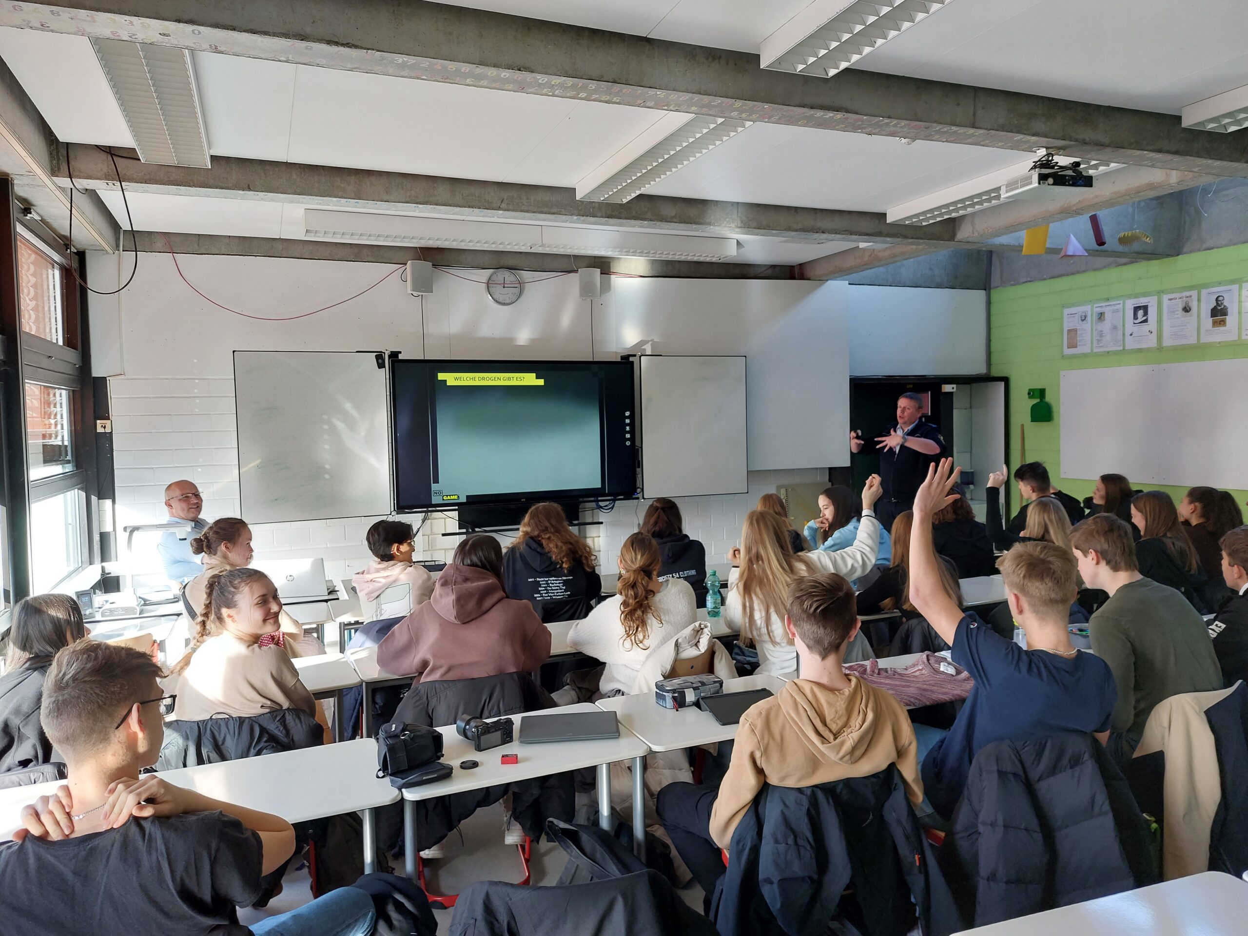 Im zweiten Teil der Veranstaltung erhielten die Schüler:innen von Herrn Neubrand dann viele Informationen, wie sich Drogen (legale und illegale) grundsätzlich auf den Körper bzw. auf das Verhalten (u.a. im Straßenverkehr) auswirken. Auch die rechtliche Lage und die Frage was bei Missachtung der Gesetze passiert bzw. welche Kosten ggfs auf einen zukommen wurde dabei von den Schüler:innen mit großem Interesse verfolgt.