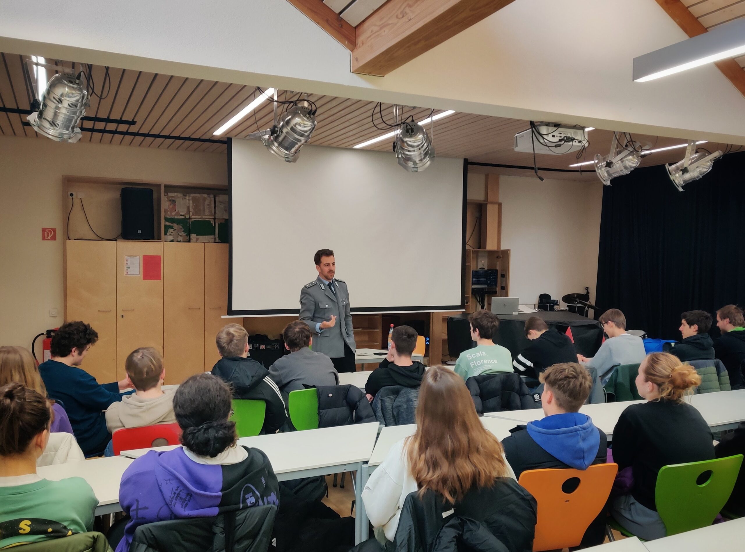Hauptmann Matei hielt dazu am 2. Februar, als Auftakt für den Gemeinschaftskundeunterricht in der Jahrgangsstufe 2 einen Vortrag, bei dem die Schüler:innen des Gymnasiums Neckartenzlingen immer wieder aufgefordert wurden mitzudenken und mitzudiskutieren sowie Fragen zu stellen.