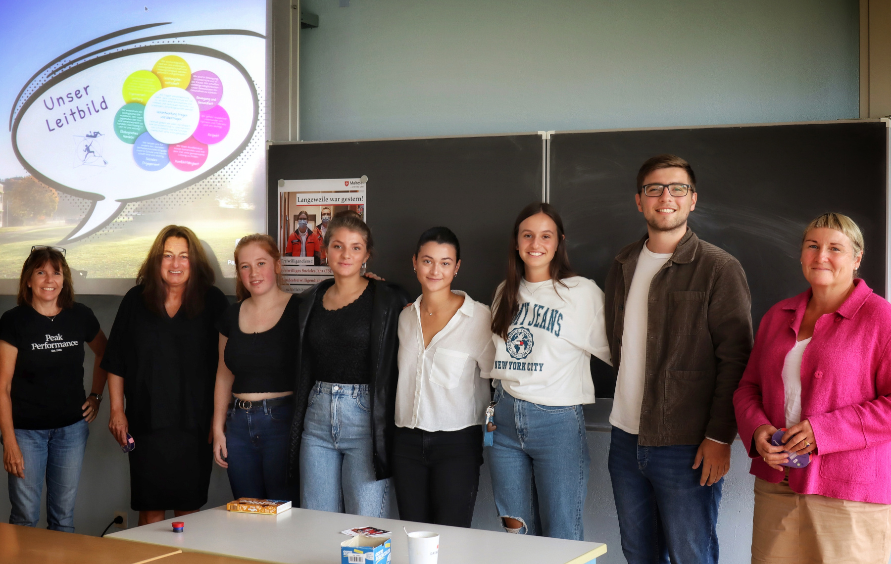 Bild (von links nach rechts): Monika Scheubel [kommissarische Schulleiterin], Ulrike Endrolath [Agentur für Arbeit], ehemalige Schüler:innen [Abijahrgang 2022], Susanne Storz [Elternbeiratsvorsitzende]
