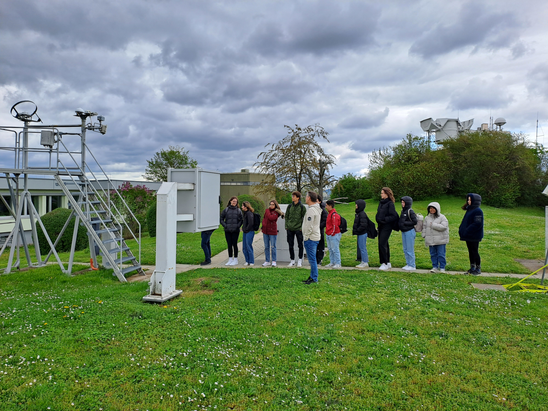 Der Besuch begann mit einem Vortrag über die Grundlagen der Aerologie: Als aerologische Aufstiegsstation steigt hier zweimal pro Tag ein Wetterballon auf. Danach wurde der Kurs durch das operationelle Großraumbüro geführt, in dem Wetterberichte und Warnungen erstellt sowie Kunden am Telefon beraten werden. In einem Vortrag über Satelliten duften die Schüler:innen selbst aktiv werden und sich im Auswerten von verschiedenen Satellitenbilder-Darstellungen üben. Beim Vortrag über die unnatürliche Klimaerwärmung konnte der Kurs mit seinem Vorwissen glänzen. Das Highlight war sicherlich die Führung durch den Klimagarten. Zuerst wurden die verschiedenen Messinstrumente gezeigt und erklärt, dann konnte der voll automatisierte Ballonaufstieg beobachtet werden. Aufgrund der Wetterlage verschwand dieser aber leider ziemlich schnell hinter den Wolken.