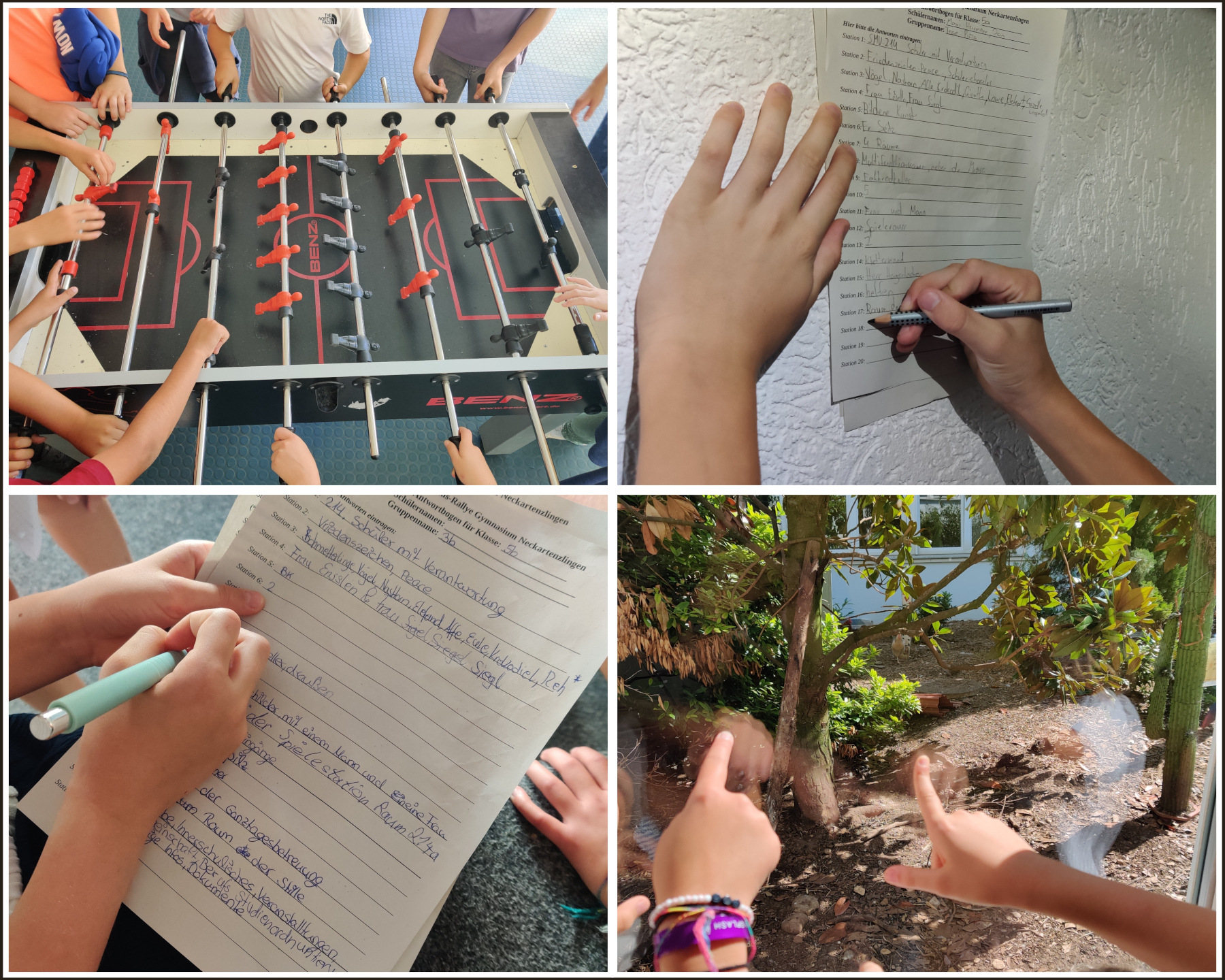 In Kleingruppen liefen sie durchs Schulhaus und erforschten alles vom Raum der Stille bis zum Fahrradkeller. Nur selten benötigten sie die Hilfe ihrer Klassenpat:innen, die sie begleiteten. Die Klassenpat:innen, alle aus der 8. Klasse, kennen sich natürlich perfekt aus und unterstützen die Fünftklässler:innen gerne in den ersten Wochen in der neuen Schule, nicht nur bei der Schulhausrallye, sondern auch beim ersten Mensabesuch oder beim Lesen des Vertretungsplans.