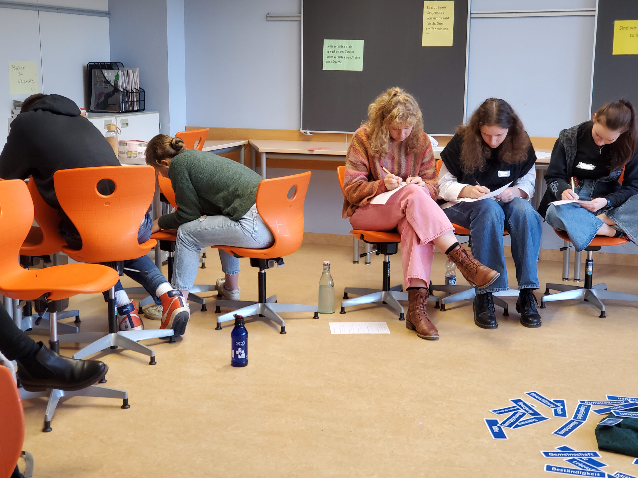 Mit diesem Zitat wurden die 17 Coaches, ihre zwei betreuenden Lehrerinnen Frau Donner und Frau Neth und die Schulsozialarbeiterin Frau Oehler zu ihrer Fortbildung zum Thema „Gewaltfreie Kommunikation“ begrüßt. Im mit Flipchart und Stuhlkreis zum Seminarraum umgestalteten Klassenzimmer erwartete Trainerin Daniela Stannat die Gruppe. Sie war extra aus Calw nach Neckartenzlingen gekommen, um mit allen Streitschlichtern drei intensive Stunden lang zu arbeiten.