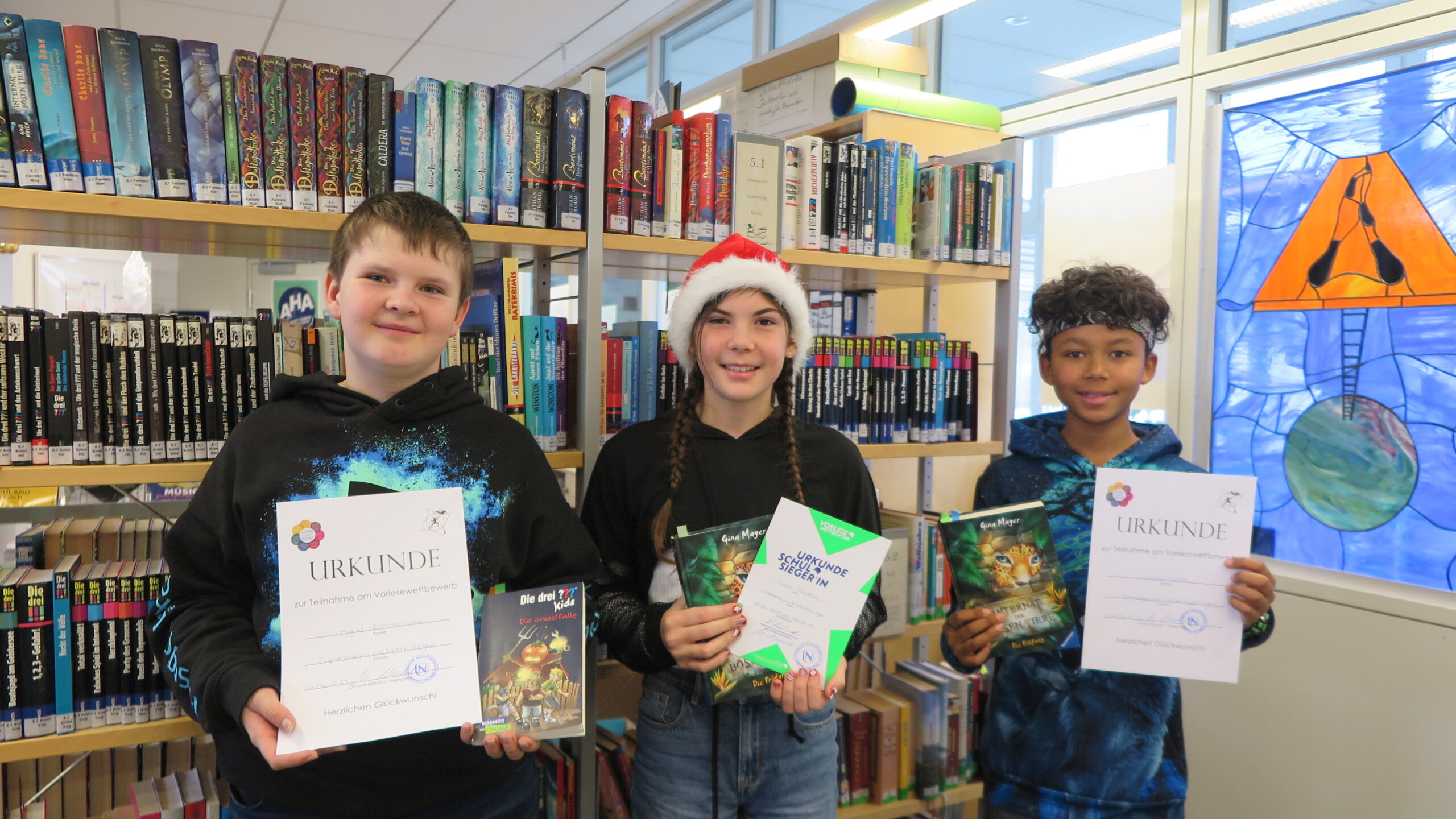 Am 4. 12. 2023 fand in den Klassen 6 der spannende Schulentscheid im Vorlesewettbewerb statt. Die Klassensieger*innen Tiara (6a), Salim (6b) und Miguel (6c) präsentierten ihre vorbereiteten Texte vor einer begeisterten Jury und einem gespannten Publikum.