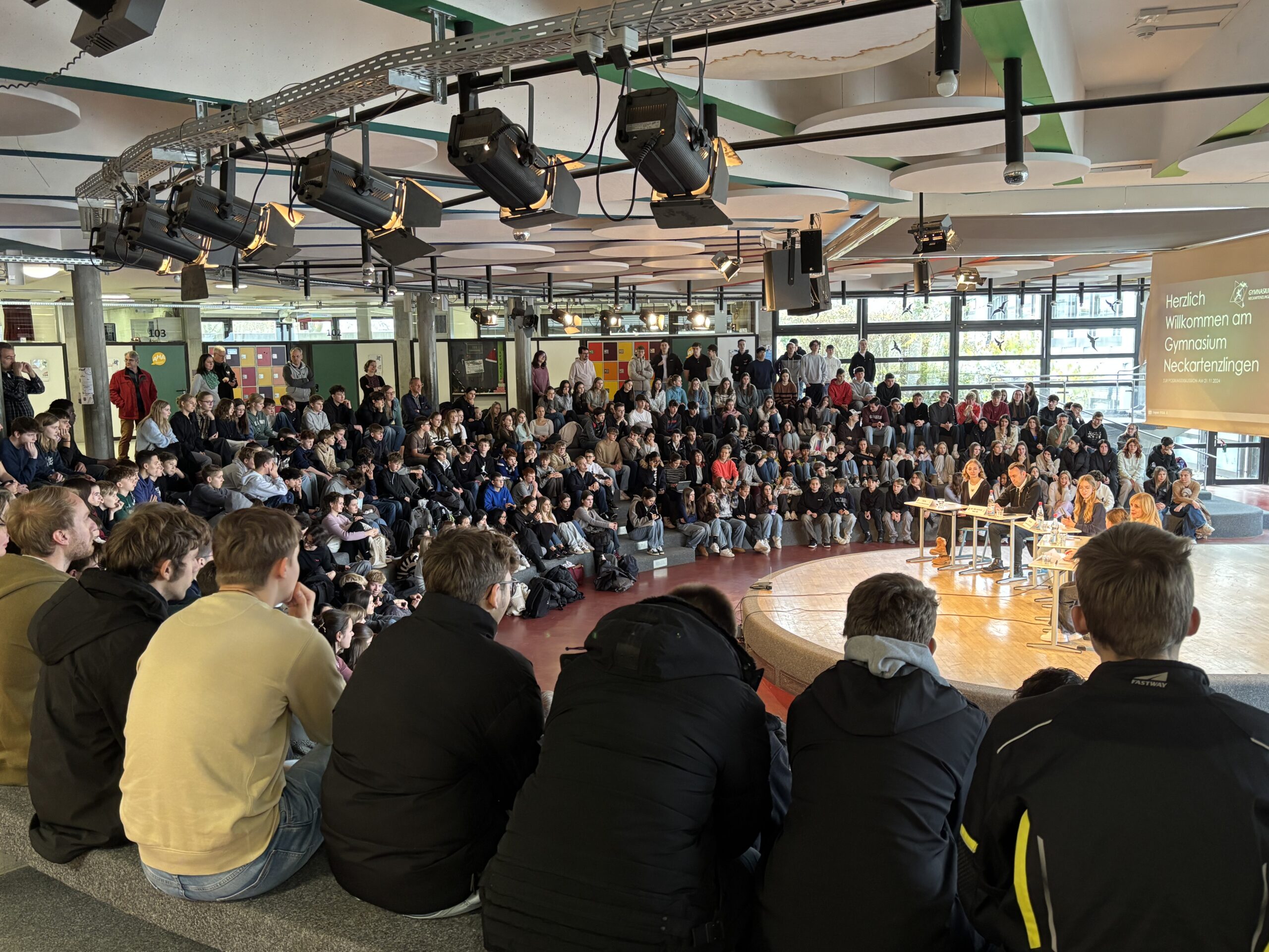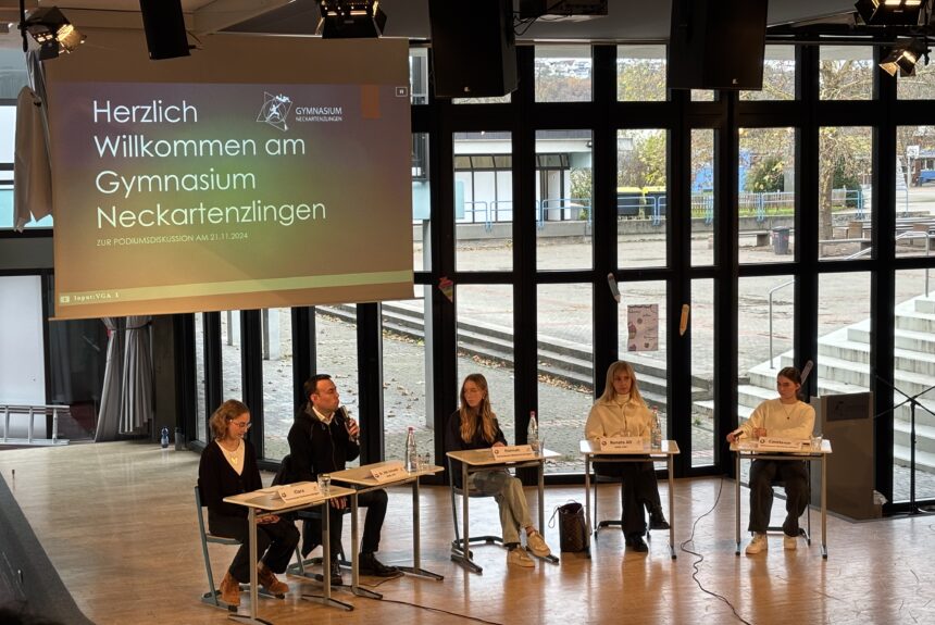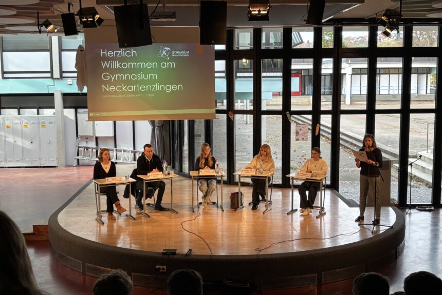 Am 21. November 2024 wurde die Große Aula des Gymnasiums Neckartenzlingen zur Bühne für eine besondere Begegnung: Die Bundestagsabgeordneten Dr. Nils Schmid (SPD) und Renata Alt (FDP) stellten sich im Rahmen einer Podiumsdiskussion den Fragen der Schülerinnen und Schüler. Das Publikum, bestehend aus den Klassen 8 bis Jahrgangsstufe 2 des Gymnasiums sowie Schülerinnen und Schülern der umliegenden Schulen des Schulzentrums, erlebte eine spannende und aufschlussreiche Debatte über aktuelle politische Themen und die Arbeit im Bundestag.