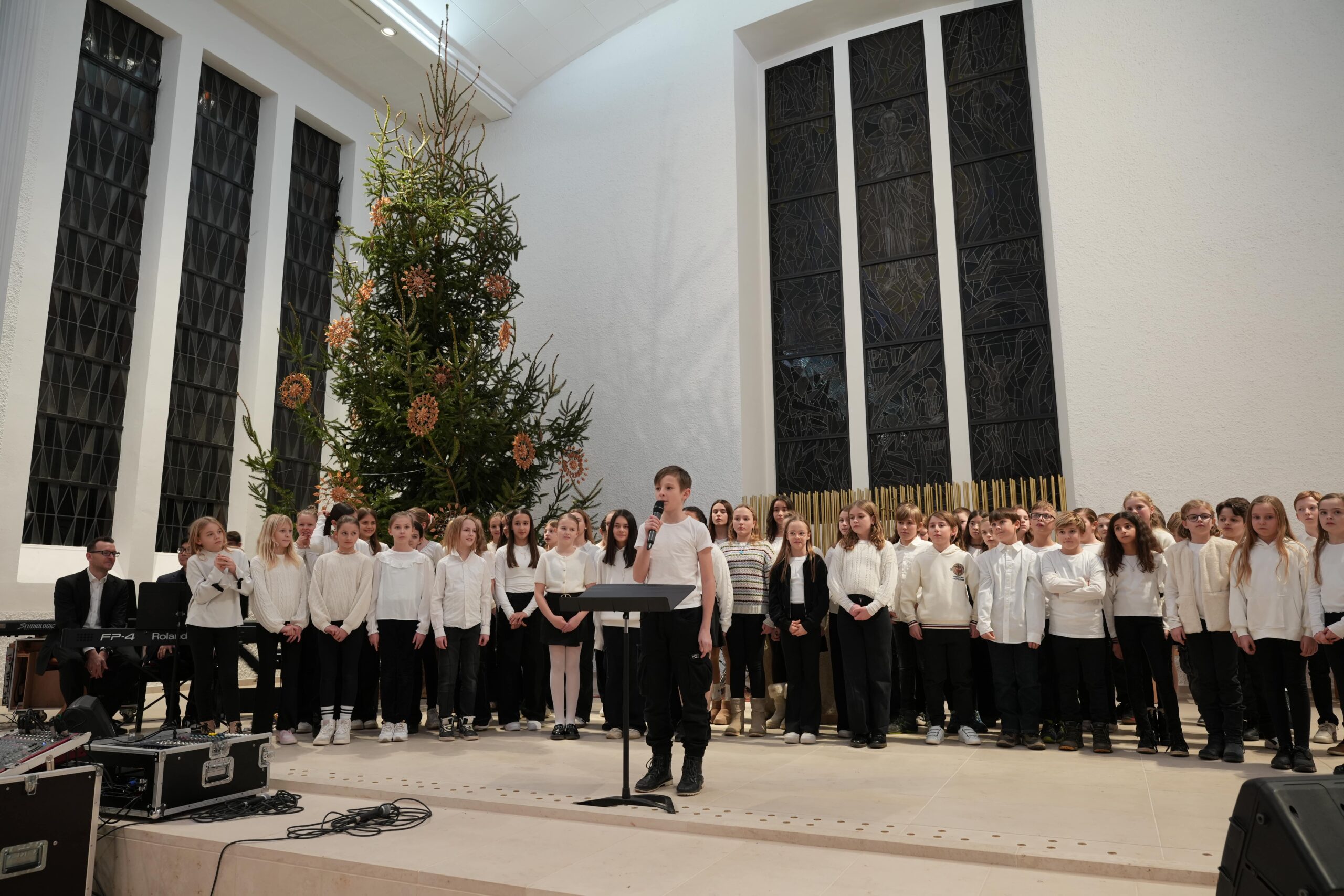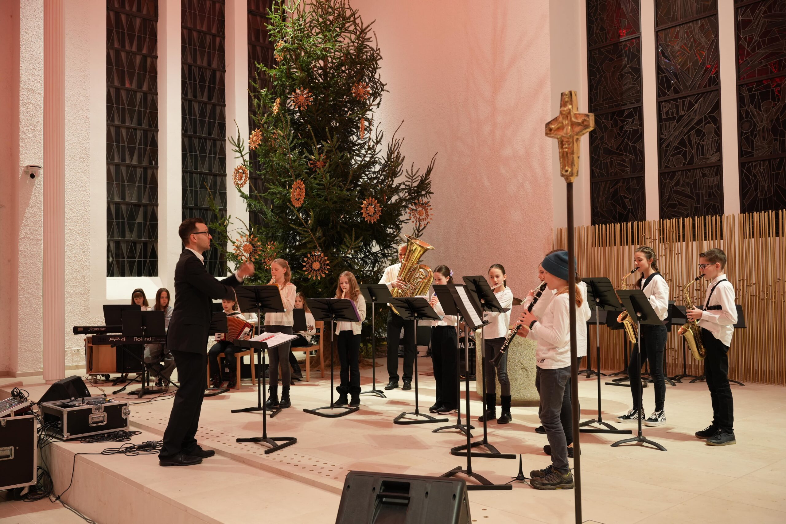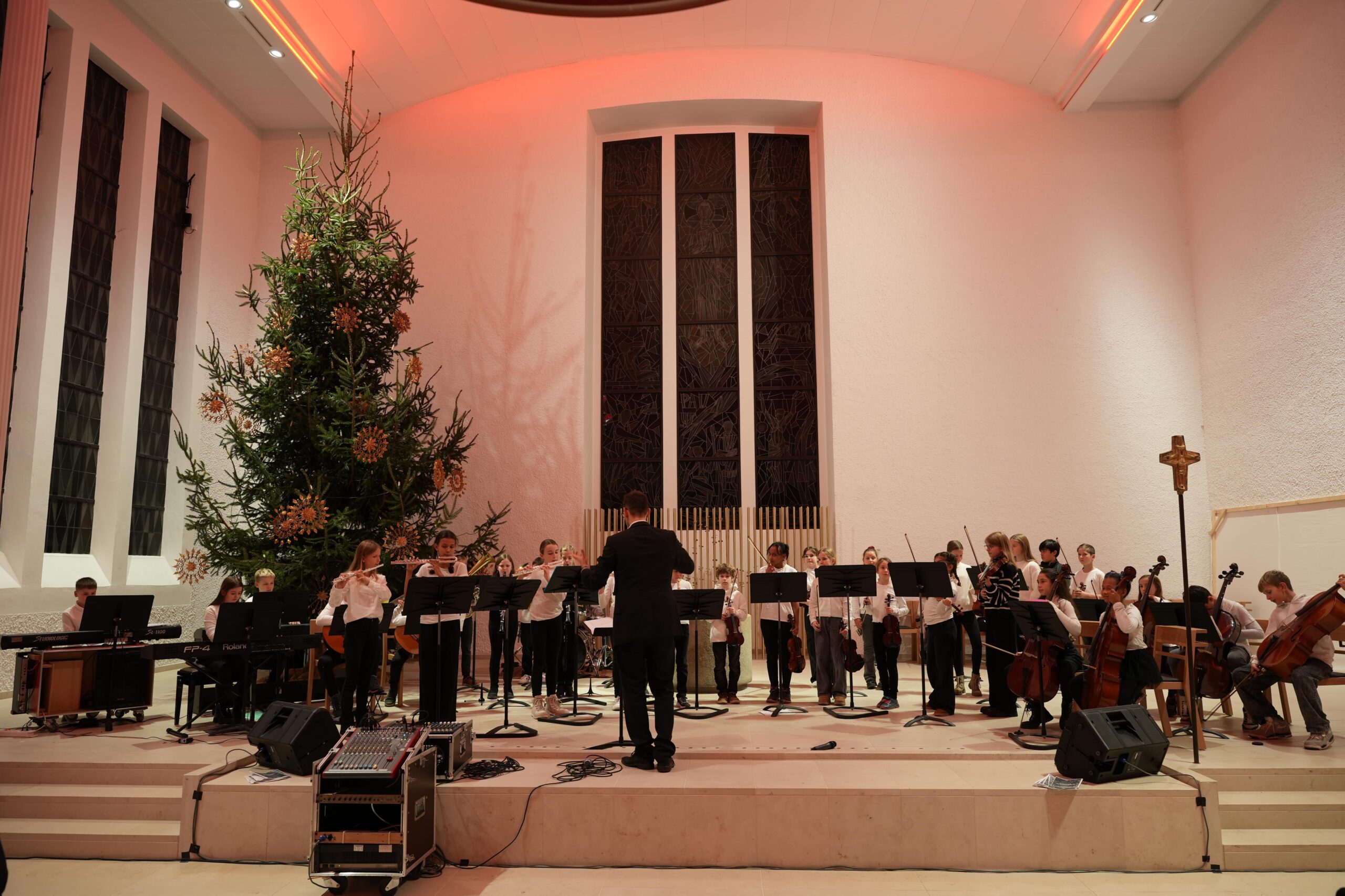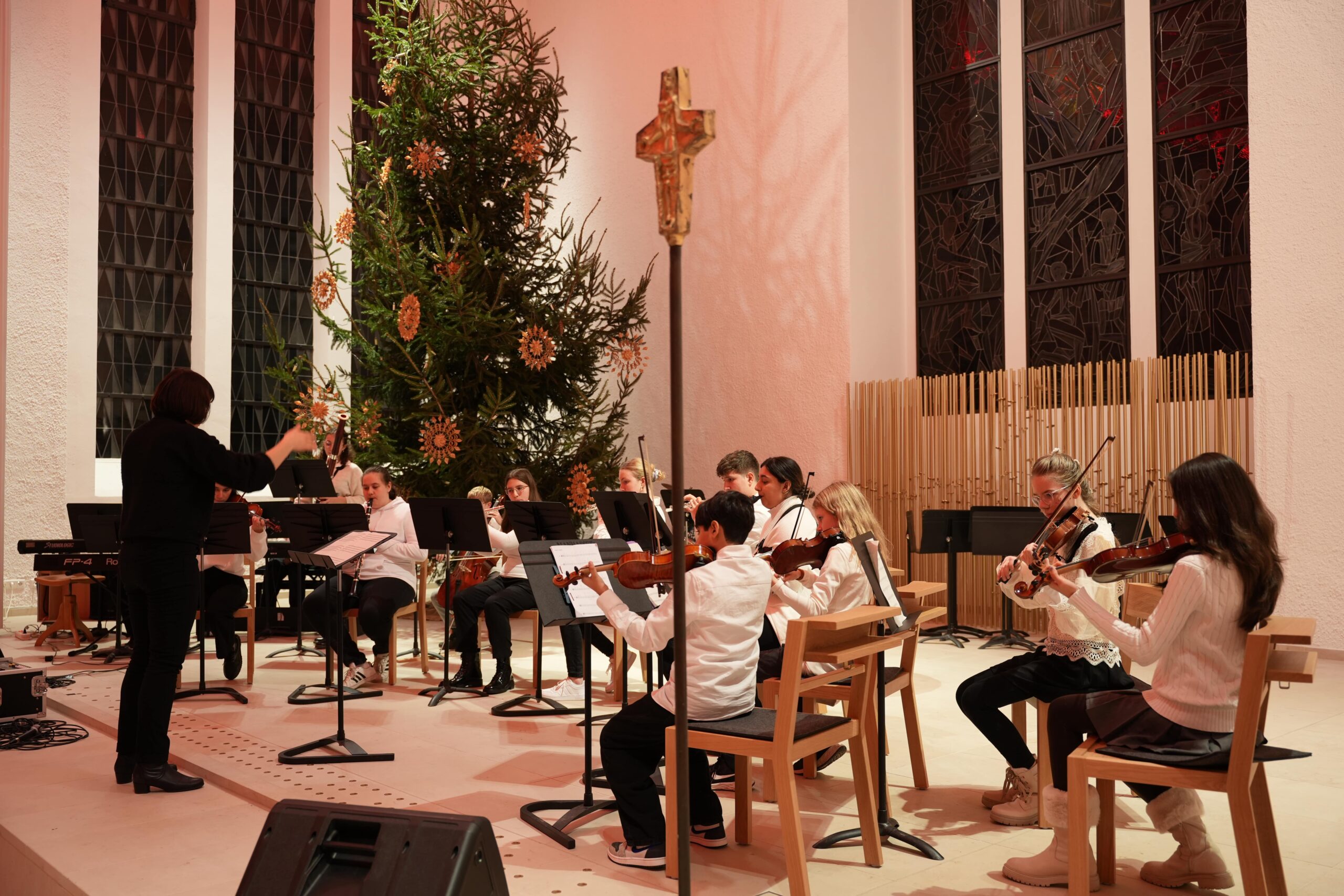 Nach einer kurzen Begrüßung durch Thomas Hermann, Pastoralreferent der katholischen Gesamtkirchengemeinde, begannen die Konzerte mit dem Auftritt des Unterstufenchors unter der Leitung von Dorothea Risse und mit Klavierbegleitung durch Sebsatian Nguyen. Die knapp 60 Sänger*innen führten drei Lieder auf („Ding Dong Bells Kanon“, „Welch eine wundersame Nacht“, „Star Canon“), die sie allesamt sicher und teilweise mehrstimmig meisterten. Im Anschluss spielten das 6er und 7er-Unterstufenensemble unter der Leitung von Joachim Kromer die Stücke „How Far I’ll Go“ und „Felix Navidad“ und bewiesen dabei große rhythmische Stabilität. Das 5er-Stufenorchester, ebenfalls unter der Leitung von Joachim Kromer, zeigte als nächstes mit „Majestic March“ und „Morgen Kinder wird’s was geben“ sein Können. Im Anschluss trat die Streicherklasse unter der Leitung von Eva Dietzfelbinger mit „Ihr Kinderlein kommet“ auf. Vor der Pause spielten die knapp 50 Fünftklässler*innen der Streicherklasse und des Stufenorchesters gemeinsam unter der Leitung von Eva Dietzfelbinger das Stück „Tango & Cha Cha“ und brachten so lateinamerikanisches Feeling in die an beiden Abenden sehr gut besuchte Kirche.