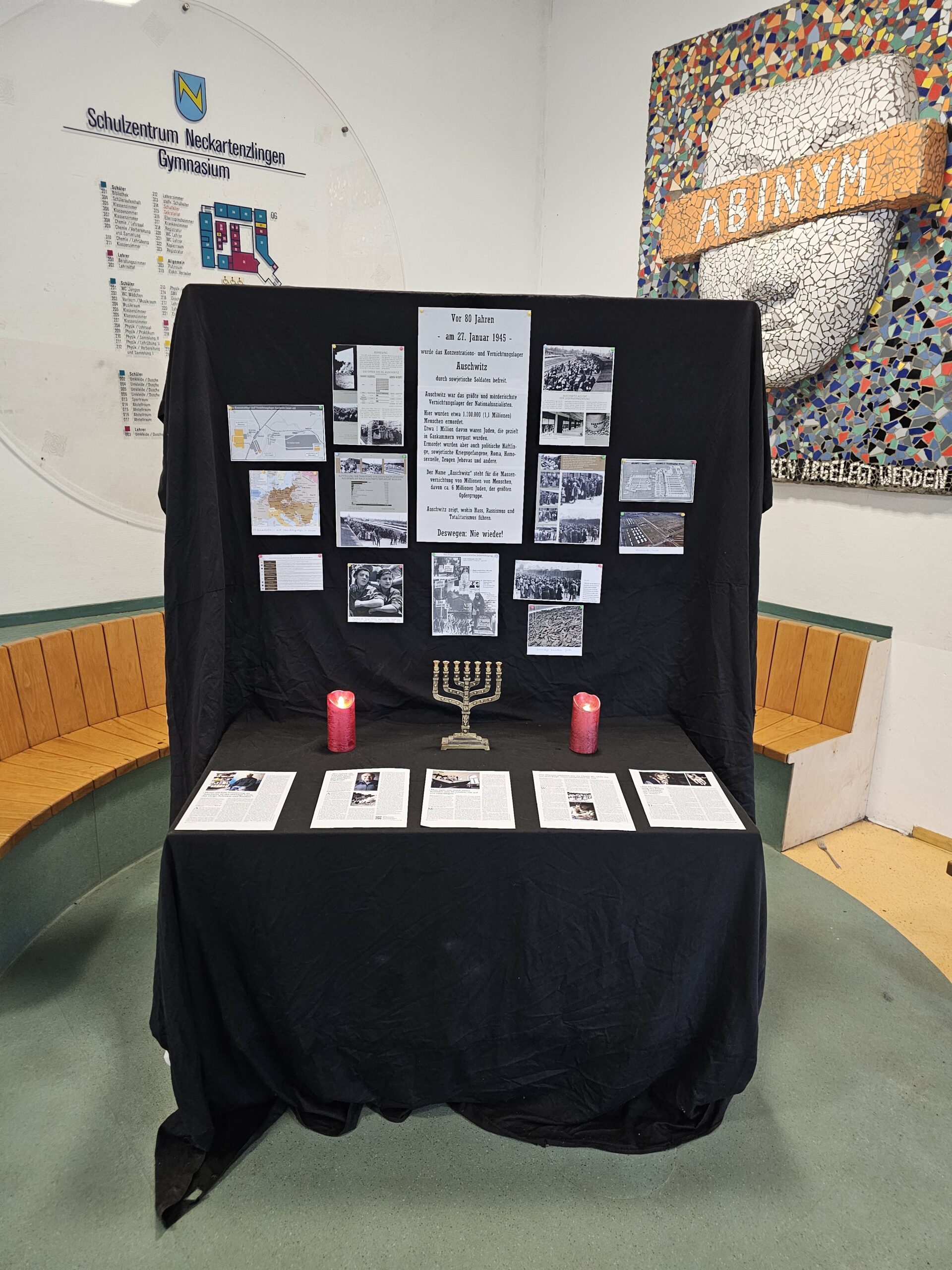 Der kleine Erinnerungsort, der zum 80-jährigen Jahrestag der Befreiung des Vernichtungslagers Auschwitz (27.1.1945, heute Gedenktag an die Opfer des Nationalsozialismus) im Eingangsbereich des Gymnasiums eingerichtet wurde, will diese Warnung weitertragen und zum Handeln auffordern: Antisemitismus, Rassismus und Totalitarismus haben nicht nur die nationalsozialistischen Verbrechen damals hervorgebracht, sondern bedrohen auch heute Freiheit, Menschlichkeit und Demokratie.