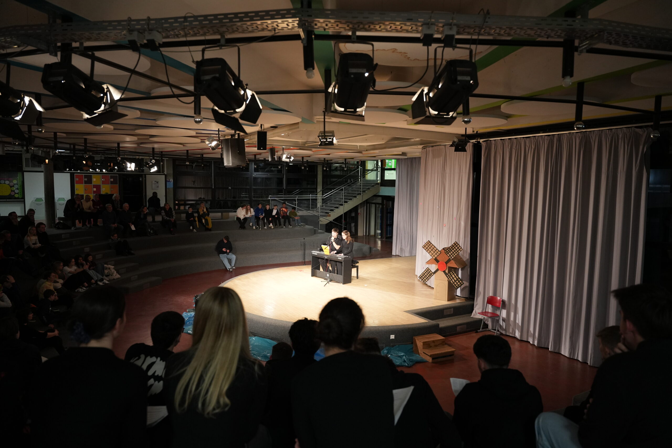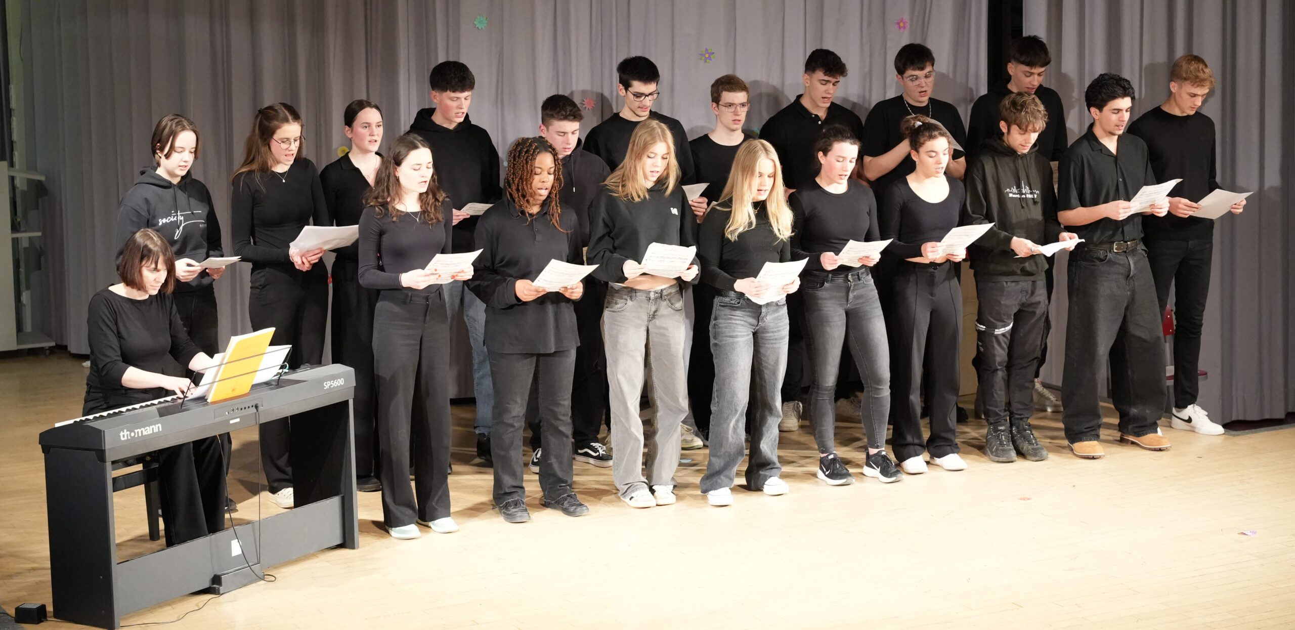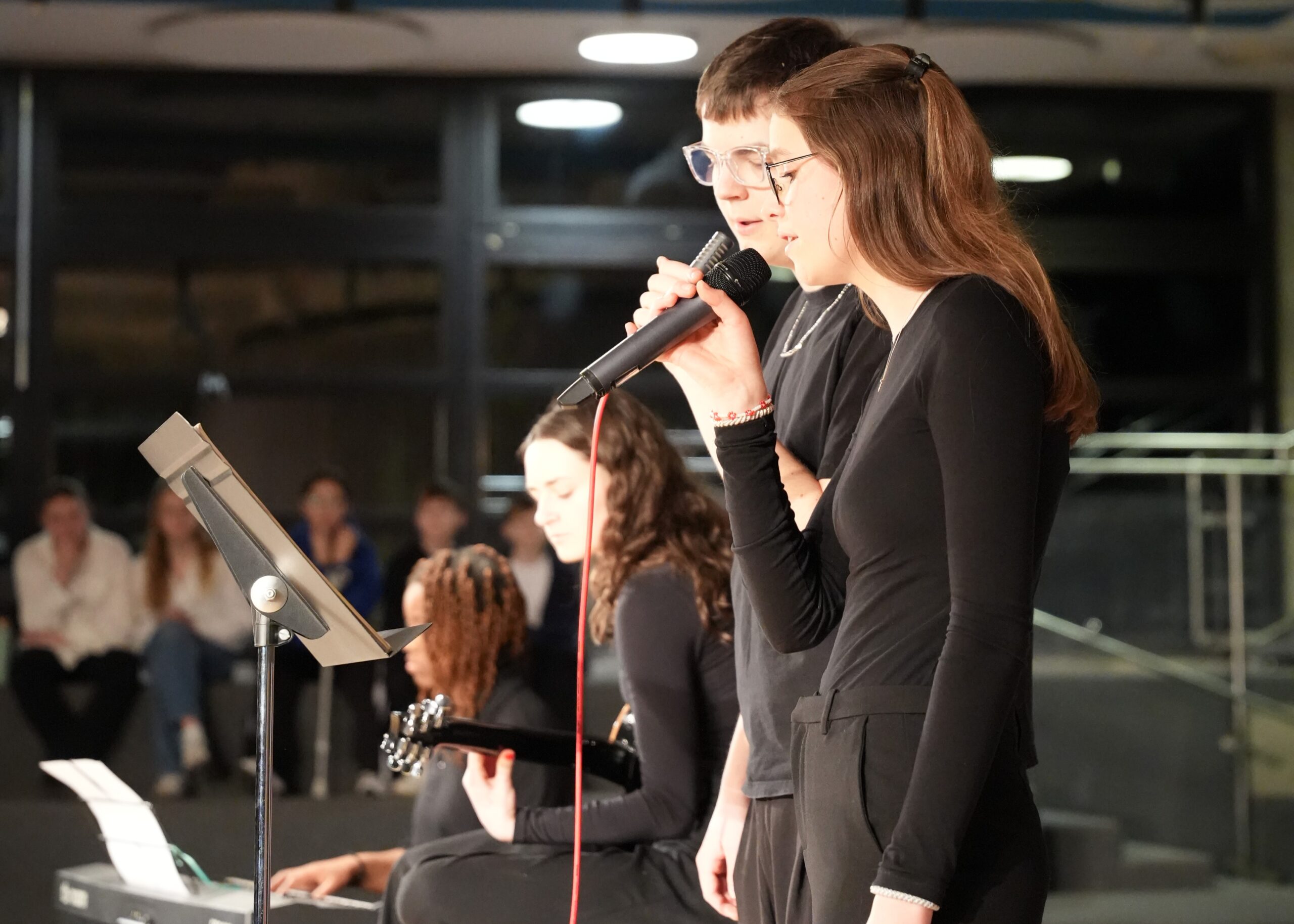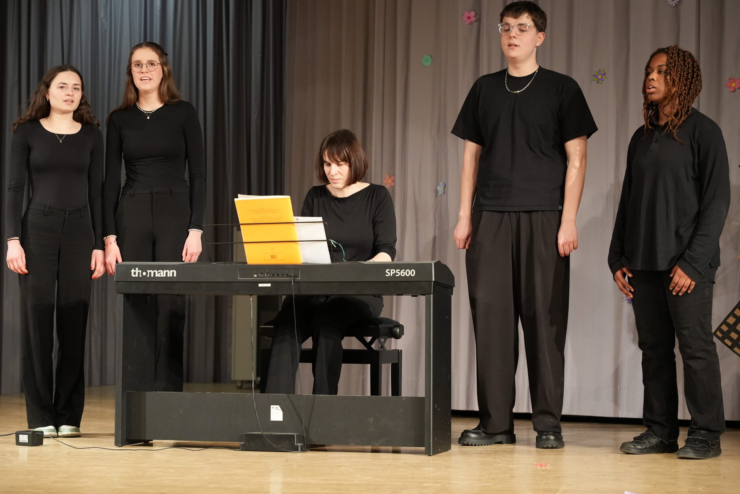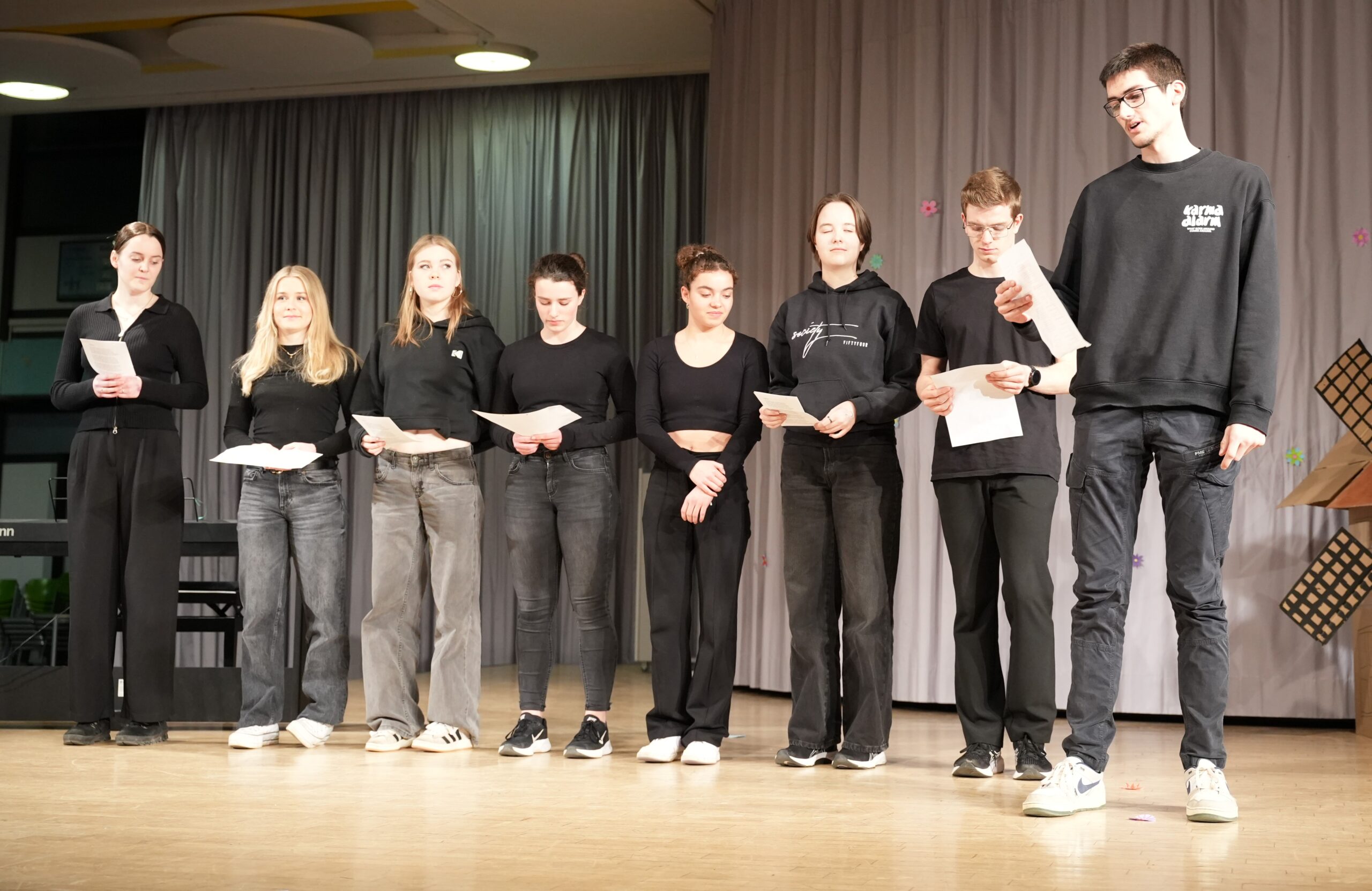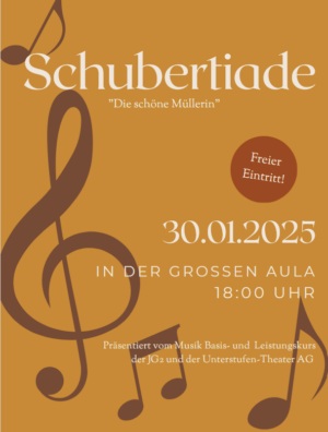 Am Donnerstag, 30. Janaur 2025, hatte der Musik-Leistungskurs der Jahrgangsstufe 12 zur Schubertiade eingeladen. Franz Schubert, Komponist der Romantik, hatte mit seinem Freundeskreis regelmäßig gesellige Abende veranstaltet, an denen er seine Kompositionen präsentierte und sein, hauptsächlich aus Intellektuellen bestehender, Freundeskreis ihm dazu Rückmeldung gab und auch eigene Gedichte und literarische Werke präsentierte. Diese Schubertiaden dienten als Vorbild für das Konzert des Leistungskurses, in dessen Mittelpunkt Schuberts Liederzyklus „Die schöne Müllerin“ stand. Verstärkung bekamen die vier Schüler*innen durch den Basiskurs der JG II, die Unterstufen Theater-AG und Musiker*innen aus der JG I. Für das leibliche Wohl sorgte der Wirtschafts-Leistungskurs der JG II, der mit Getränken und Fingerfood Geld für die Abikasse sammelte und gleichzeitig dem Abend eine sehr gemütliche und entspannte Atmosphäre verlieh.