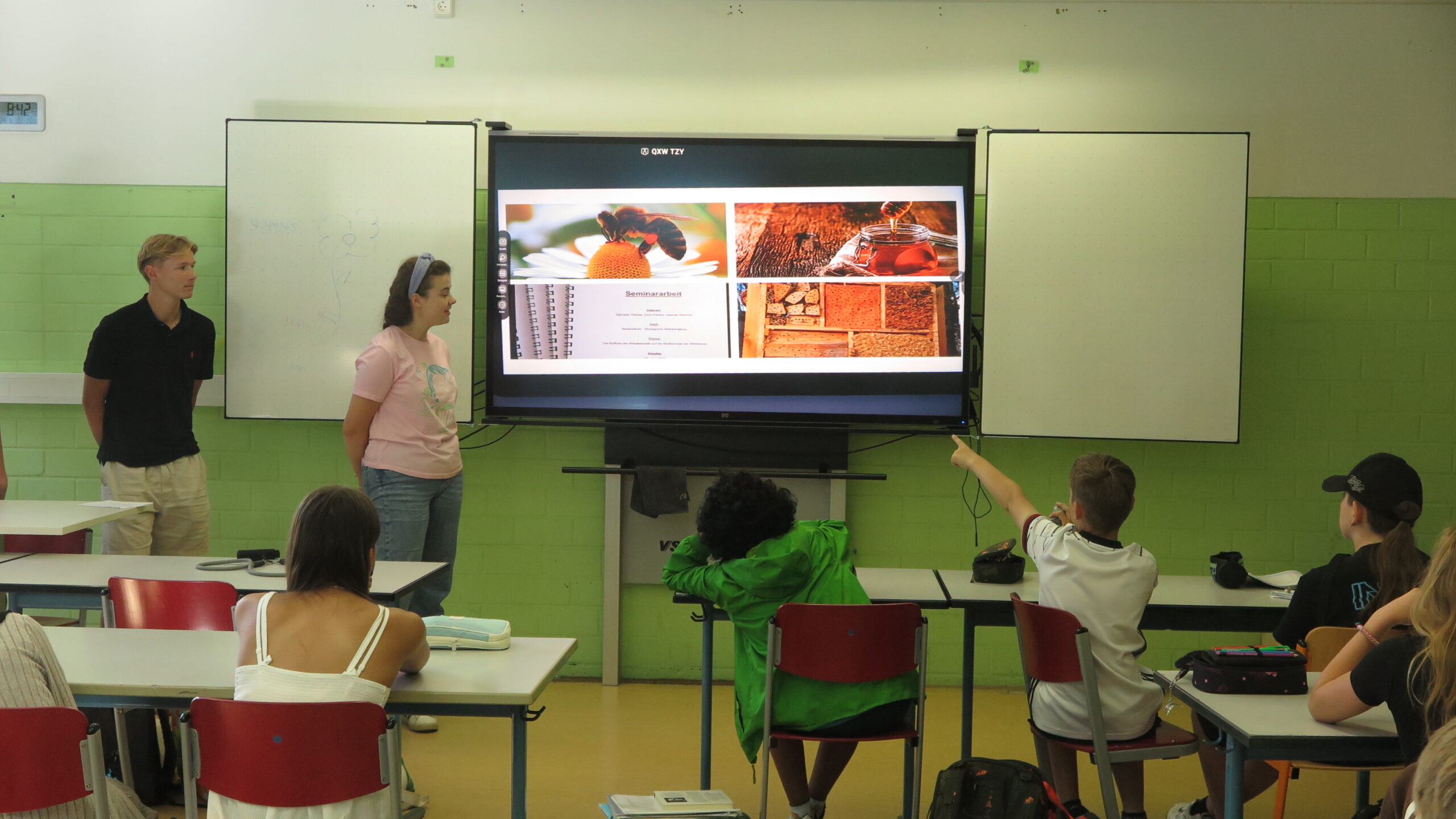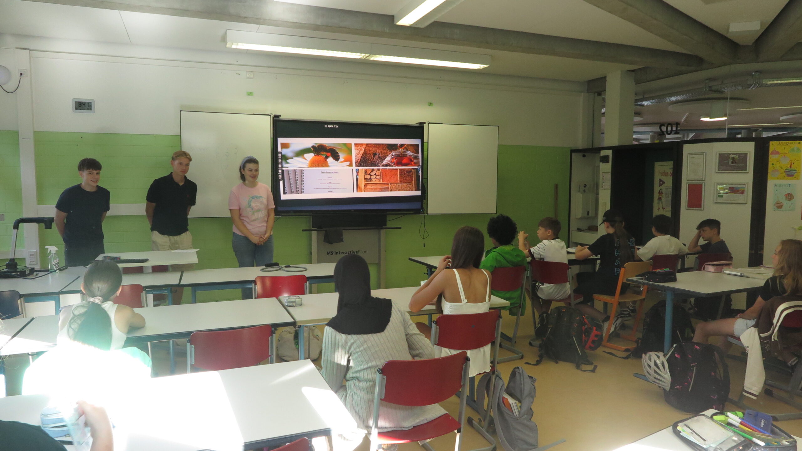 Am 24.06. in der zweiten Stunde haben uns Clemens, Enzo und Hannah aus der JG 1 besucht und uns über ihren Seminarkurs berichtet. Ihre Problemfrage war: Wie gestaltet sich die Biodiversität der Wildbiene im Zeitalter des Klimawandels? Um diese Frage zu beantworten haben die drei unter anderem ein Bienenhotel gebaut.