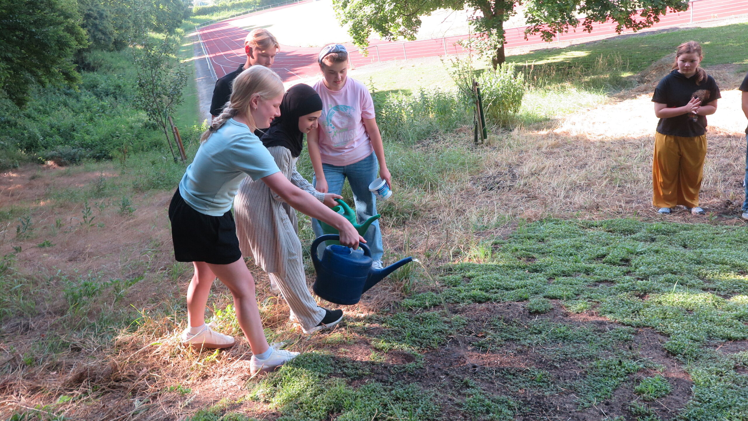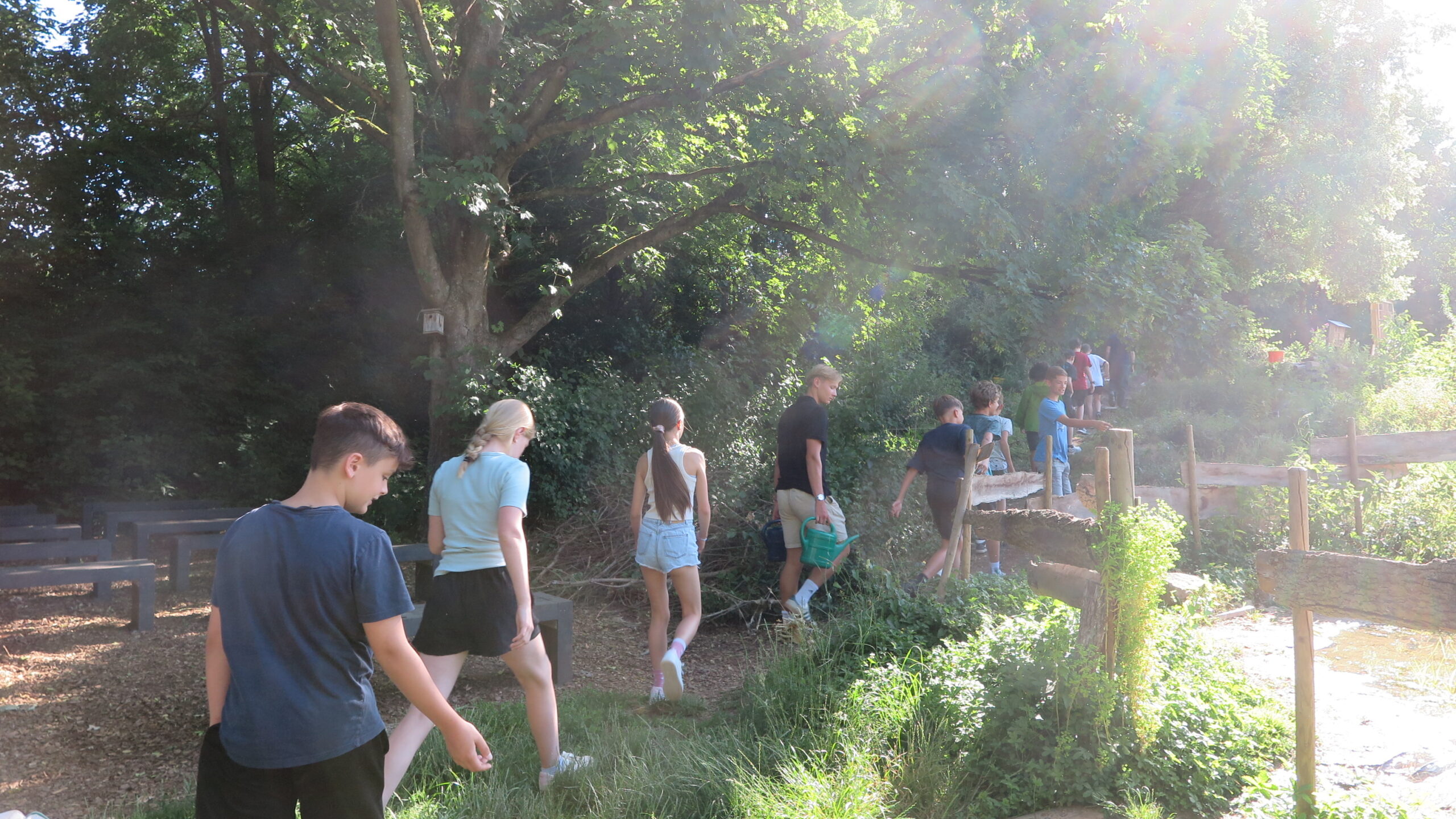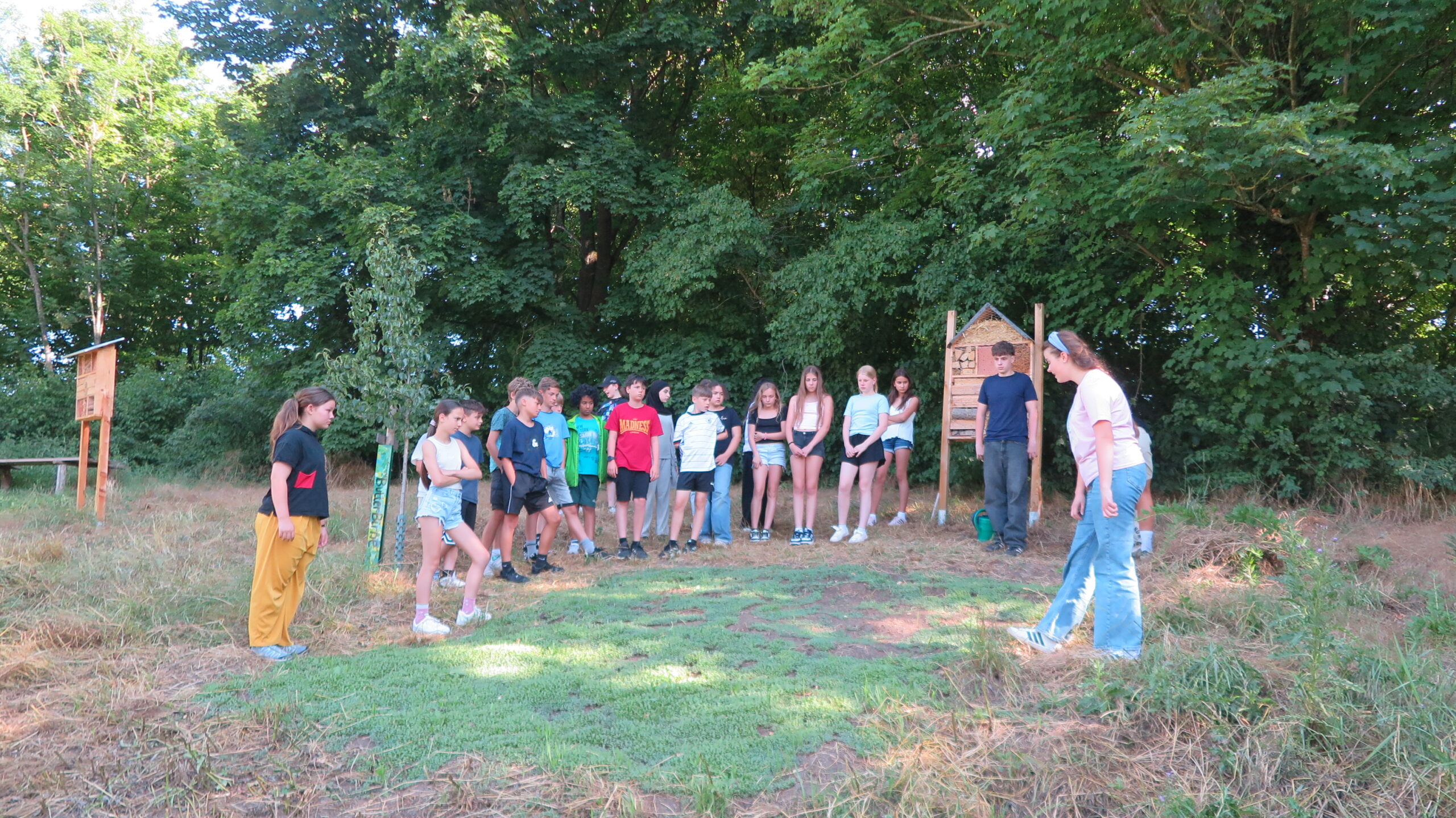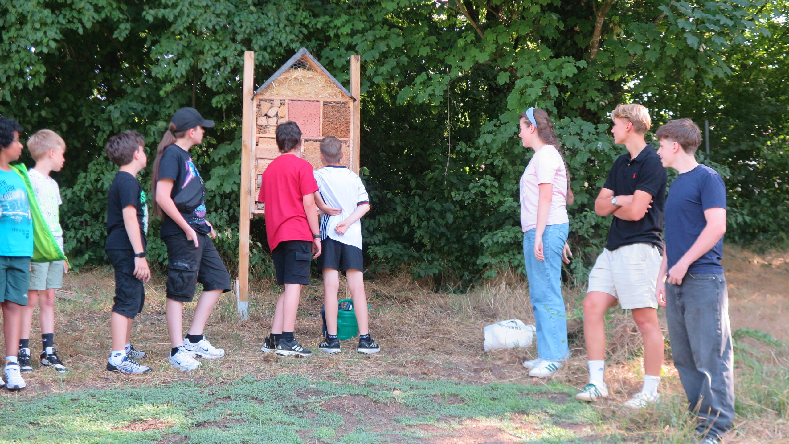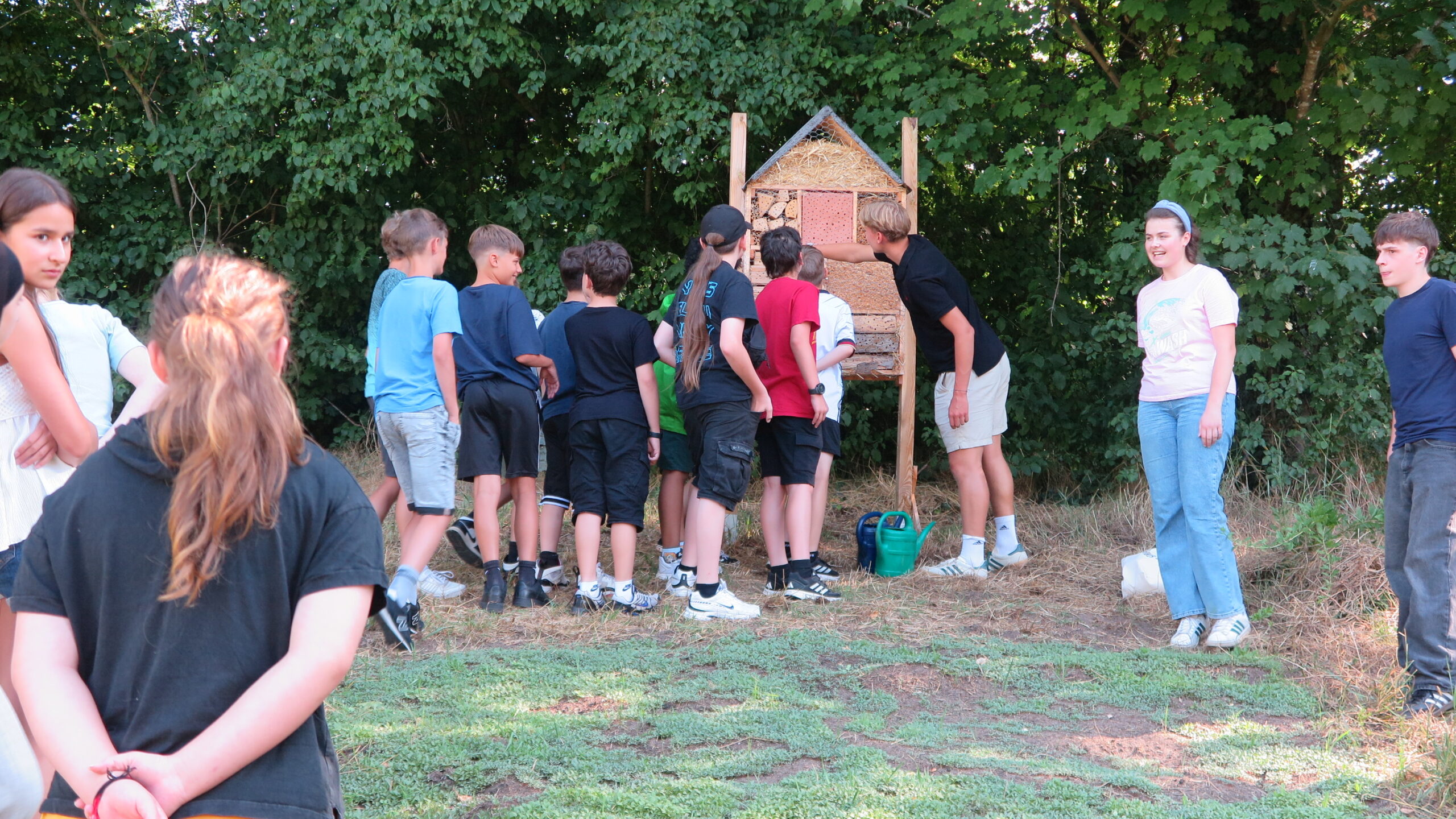 Zum Schluss sind wir rausgegangen und haben das Bienenhotel betrachtet. Es haben tatsächlich schon ein paar Bienen ihn als Brutkasten benutzt. Enzo, Clemens und Hannah haben vor dem Hotel eine Wildblumenwiese angelegt, in die wir auch ein paar Samen werfen durften.