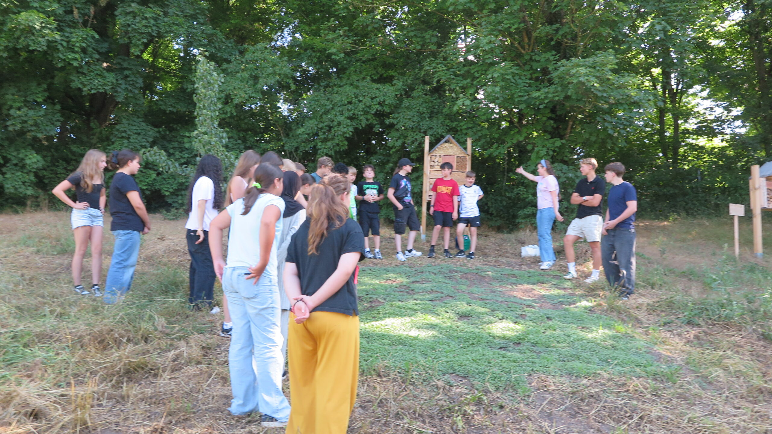 Dann haben wir alle als Klasse auf einem Zettel unterschrieben, den die drei dann auf die Rückseite des Hotels geklebt haben, um zu bestätigen dass das Bienenhotel Enzo, Clemens, Hannah und der 6b gehört. Es war eine spannende, aufschlussreiche Stunde und wir sind gespannt, ob nächstes Jahr die Blumenwiese gedeiht.