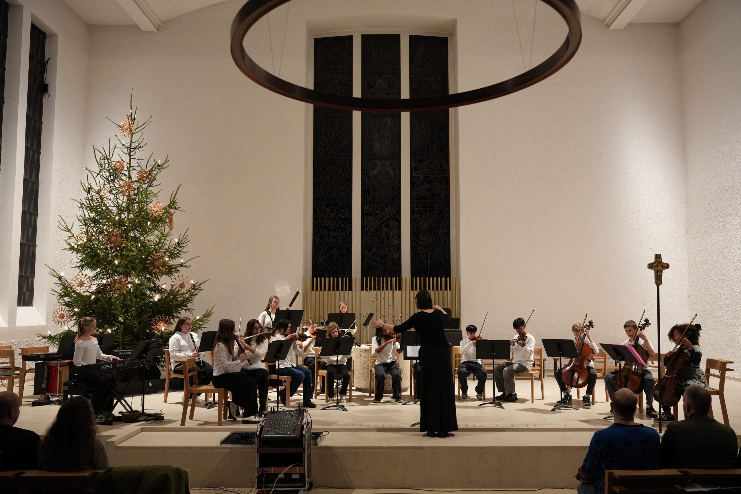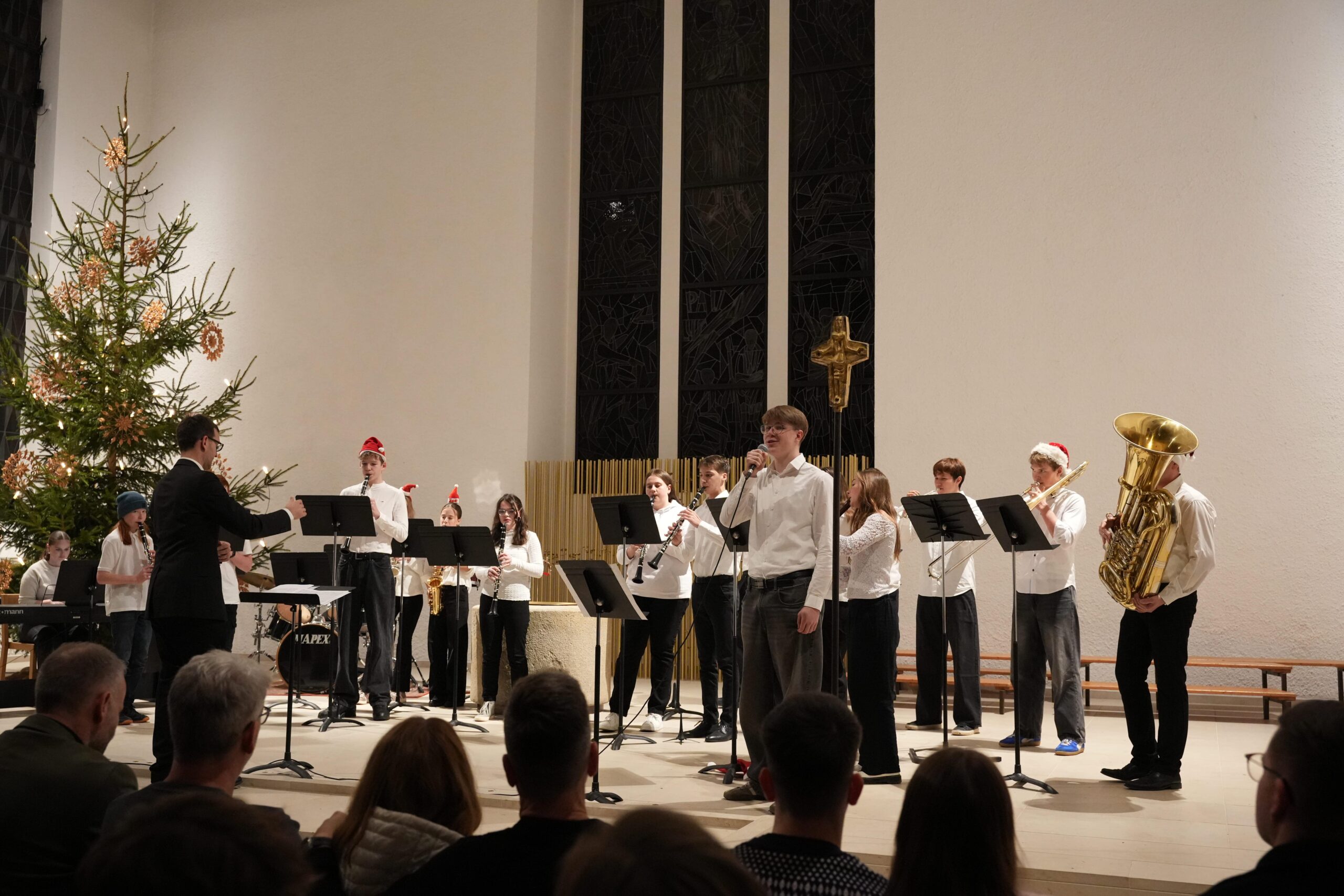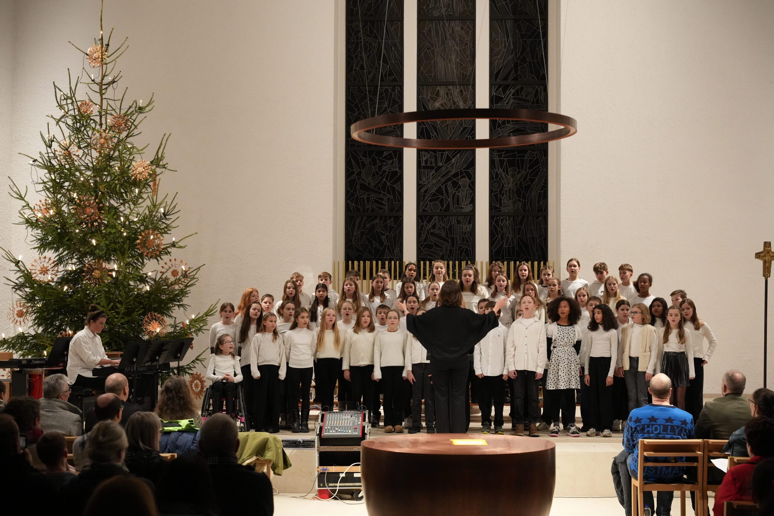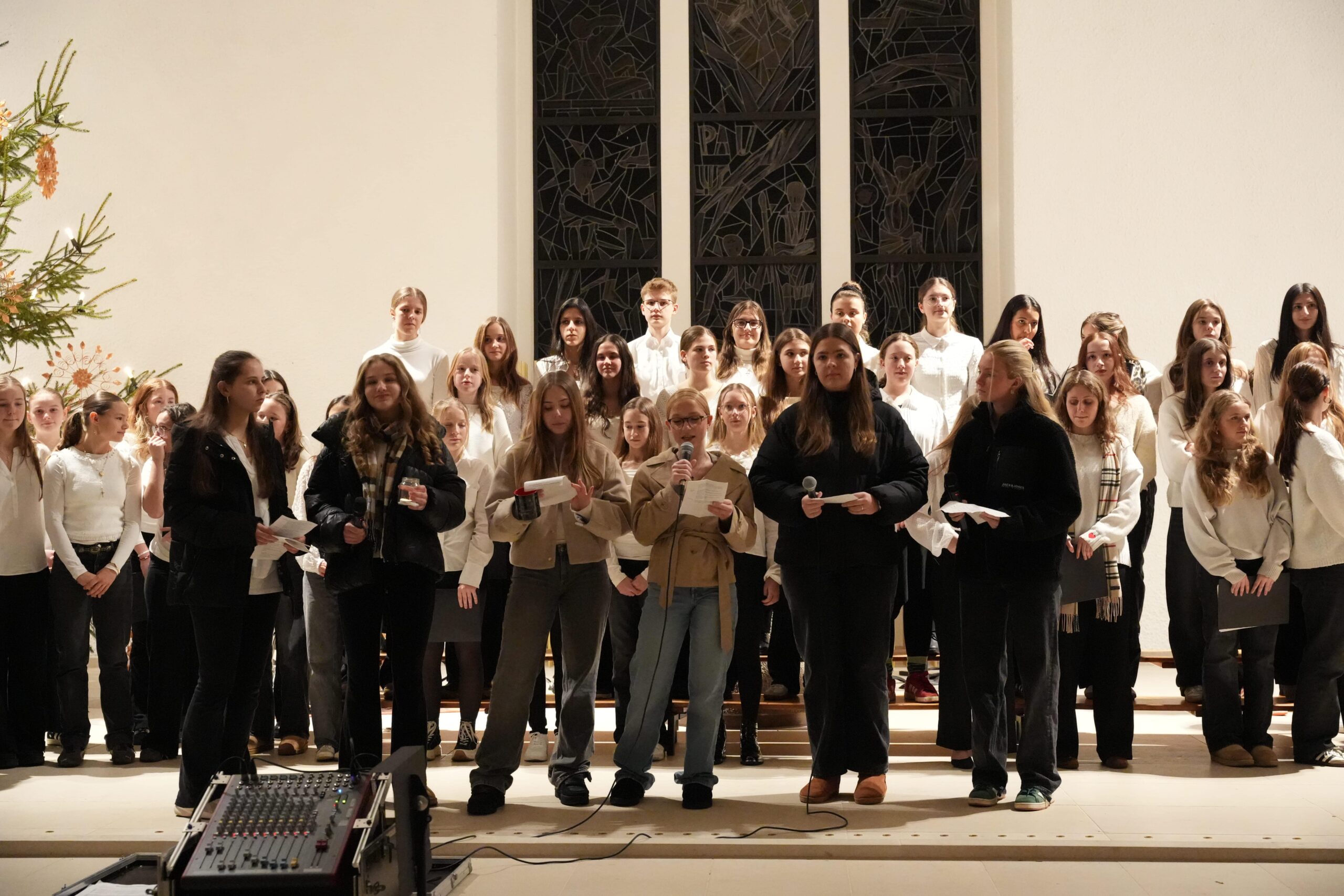 Nach einer kurzen Begrüßung begann das Konzert mit dem Auftritt des Unterstufenchores (Leitung: Dorothea Risse) mit Klavierbegleitung durch Hannah Kimmich (JG2). Die Sänger*innen eröffneten den Abend mit „Fröhliche Weihnacht überall“, gefolgt von „Dona nobis pacem“ und dem modernen Arrangement „That’s Christmas to Me“.