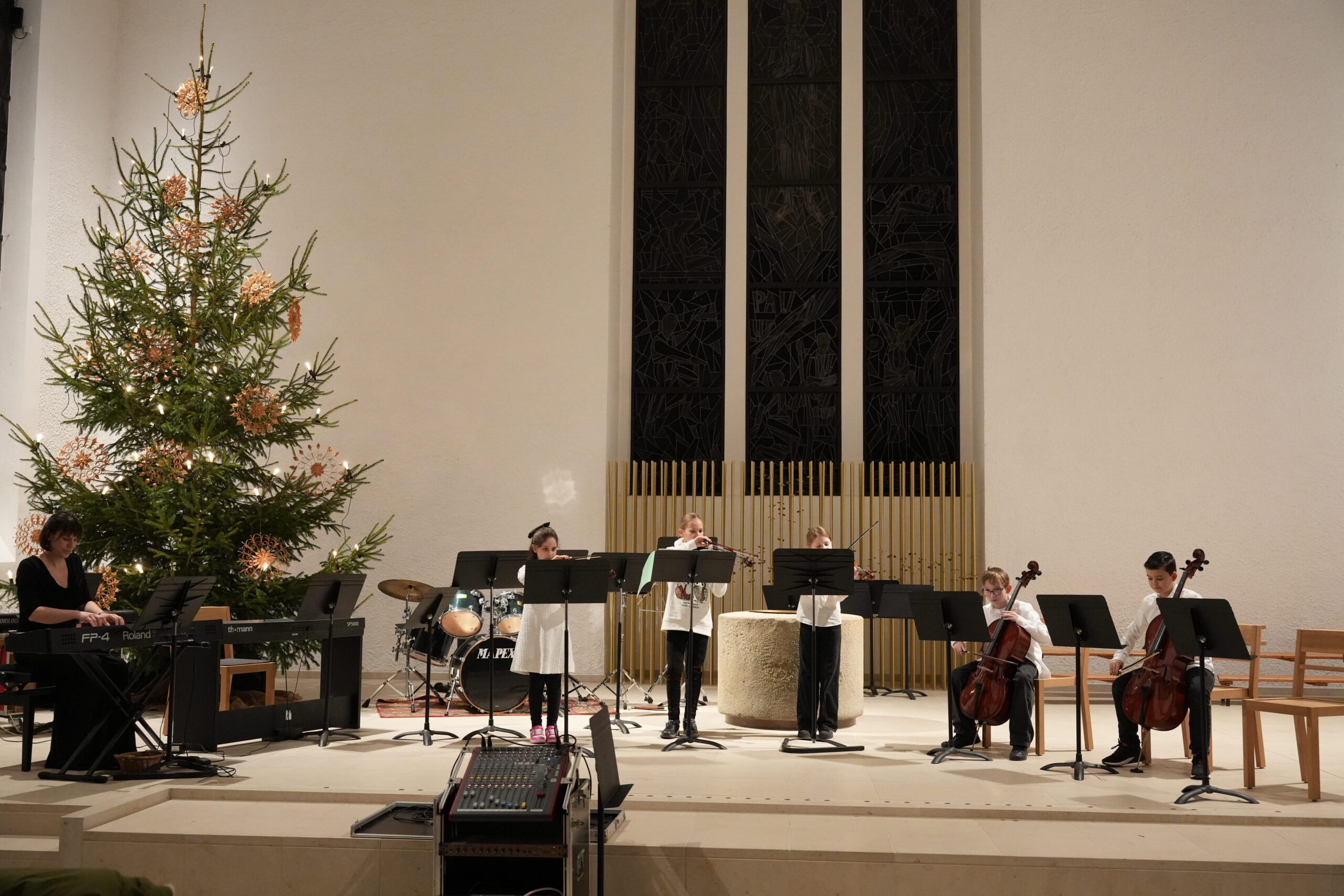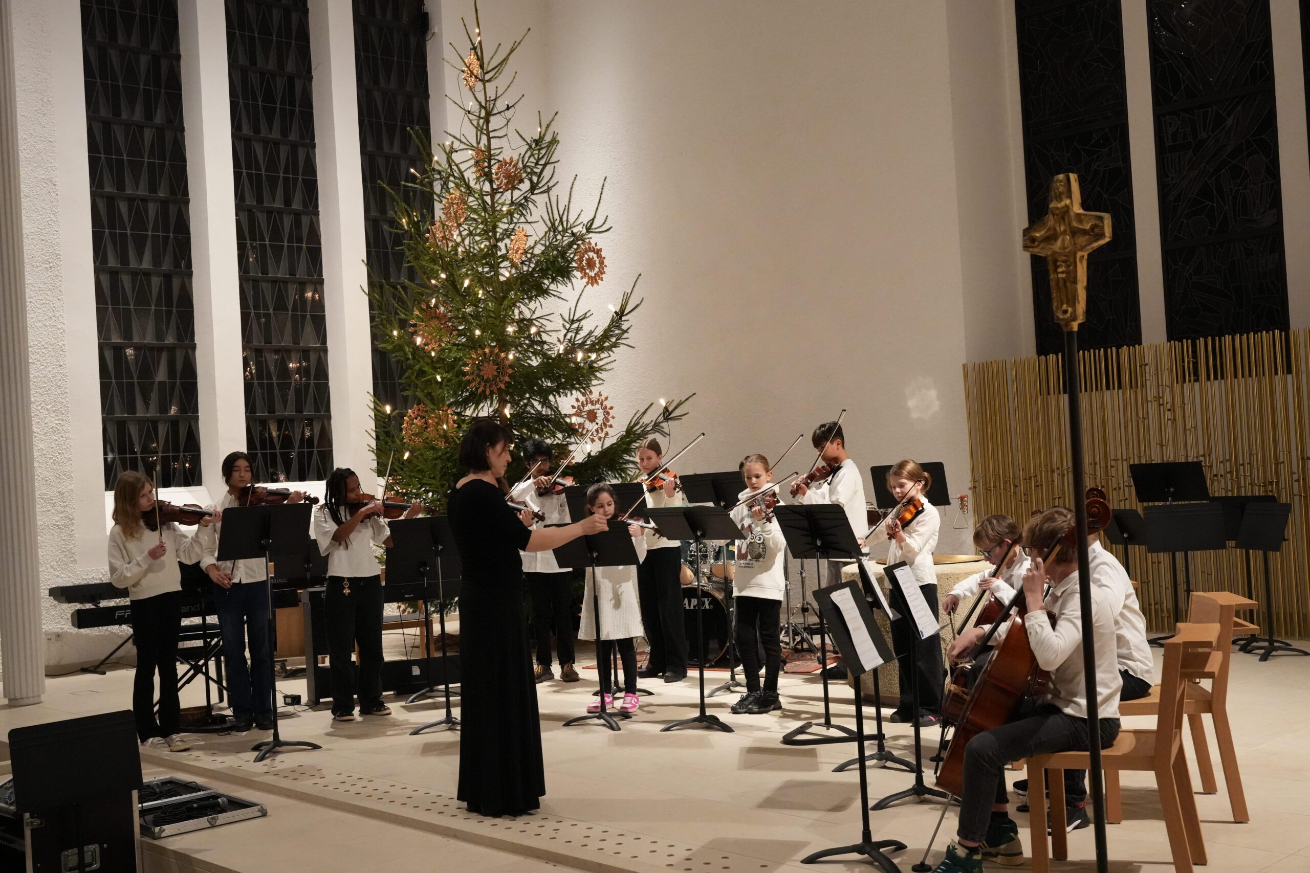 Es folgte das 5er‑Stufenorchester unter der Leitung von Joachim Kromer mit den Stücken „Alle Jahre wieder“ und der „Kleinen Weihnachtsfantasie“. Anschließend präsentierte die 5er‑Streicherklasse (Leitung: E. Dietzfelbinger, Sonja Schindele) mit „Open Waltz“ und „Morgen kommt der Weihnachtsmann“ warme Streicherklänge.