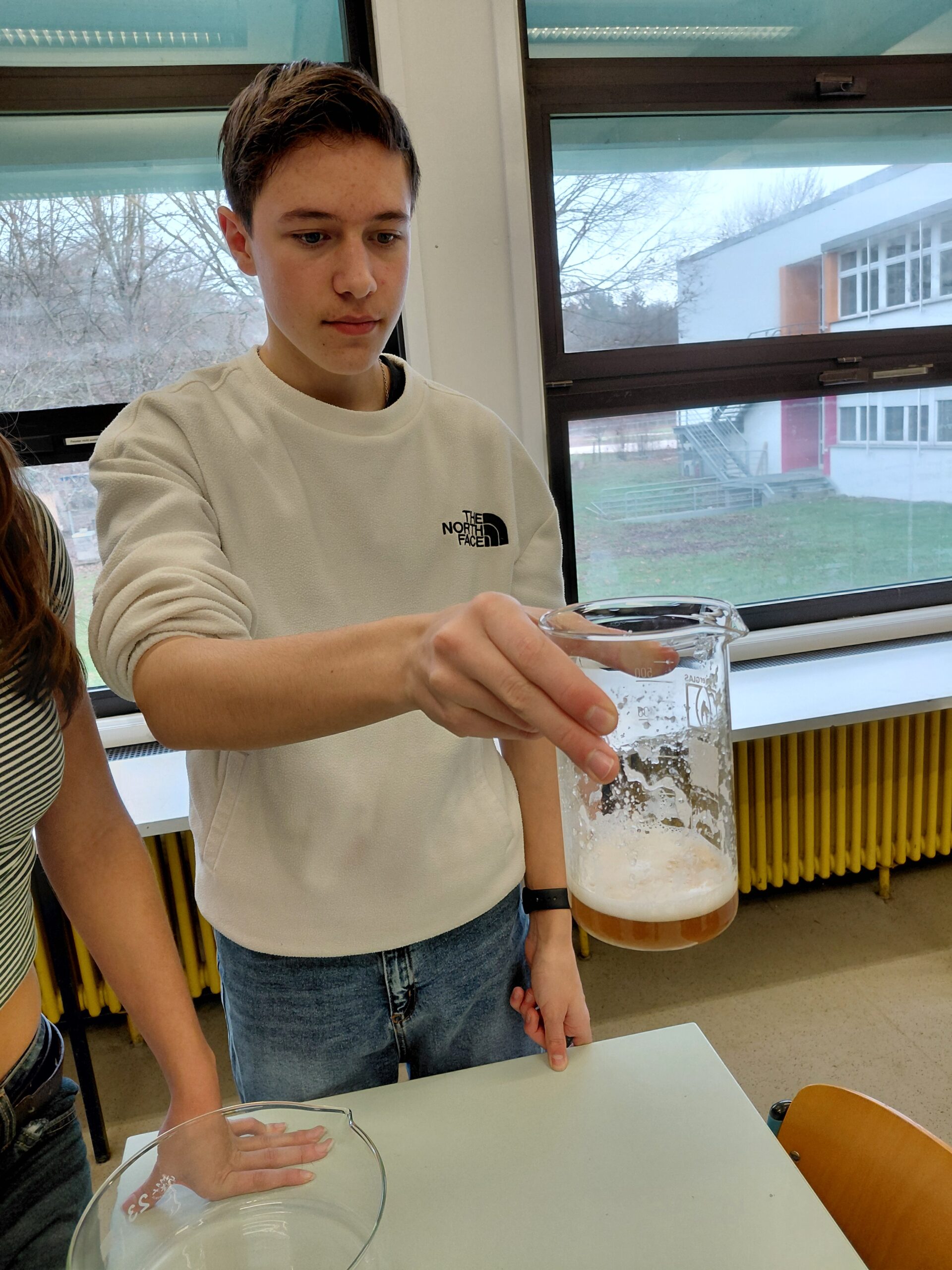 Dabei stellten sie die Perlen des Bubble Tea (sog. Popping Boas) mit Saft bzw. Sirup oder Essig in einer Hülle von Natrium-Alginat, einem natürlichen Extrakt aus Braunalgen, her. Über verschieden Zwischenschritte, Ausprobieren & Abändern der Rezeptur konnte schließlich ein vorzeigbares Produkt hergestellt und natürlich am Ende auch verkostet werden.