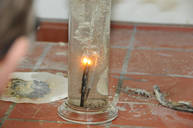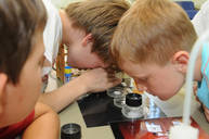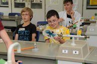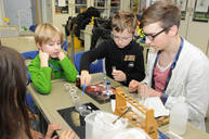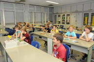 Die Vorfreude und Aufregung der Grundschulkinder ist immer groß, gilt es doch, „echte“ wissenschaftliche Versuche kennenzulernen. Nach der Begrüßung durch Frau Frank, Chemielehrerin am Gymnasium, bekommen die Schüler zuerst eine Geschichte erzählt: Ein Kriminalfall soll gelöst werden! Dazu müssen 3 verschiedene Proben, am Tatort gefunden, chemisch untersucht werden, um den Täter zu entlarven. Fachmännisch betreut von den Mentoren und ausgestattet mit Schutzbrillen, Reagenzgläsern, Pipetten und Bunsenbrennern lernen die Schüler, jeweils in kleinen Gruppen, den ersten Umgang mit chemischen Substanzen kennen. Selbstverständlich gelingt es am Ende allen jungen Wissenschaftlern, die richtige Spur zu finden und damit den Fall zu lösen!