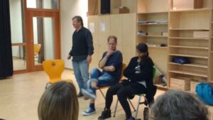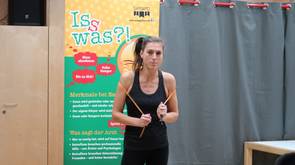 In einem nächsten Abschnitt wurde theaterpädagogisch gearbeitet. Carsten und Emma spielten zunächst eine mögliche Szene aus einer Familie vor. Emma als Tochter „Conny“ kommt von der Schule nach Hause und der Vater (Carsten) bemerkt, dass seine 13-jährige Tochter nach Zigarettenrauch riecht. Als er sie darauf anspricht, ignoriert sie dies zunächst, weicht seinen Fragen aus und entzieht sich der Auseinandersetzung. Herr Butsch forderte nun die Teilnehmer auf, sich im Partner- und Gruppengespräch alternative Handlungsmöglichkeiten für die Eltern zu überlegen. Im Plenum wurden verschiedene Möglichkeiten vorgestellt und diskutiert und eine mutige Mutter und eine mutige Lehrerin schlüpften nacheinander in die Rolle von Connys Mama und spielten ihre persönlichen Lösungsmöglichkeiten mit der „Tochter“ durch. Schnell zeigte sich, dass Kinder oft unerwartet handeln und sensibles Vorgehen gefragt ist. Die beiden kurzfristig zu Schauspielern ernannten Erwachsenen hielten sich dabei jedoch wacker und ließen sich nicht beirren, auch wenn so manche Reaktion der „Tochter“ (wieder einmal beeindruckend spontan und authentisch gespielt von Emma) für allgemeine Erheiterung sorgte.