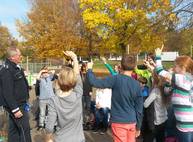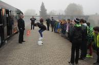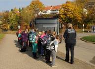 Mit Reifen, Wasserkanistern, Fähnchen und Pylonen wurden Situationen aus dem Alltag nachgestellt und nötige Sicherheitsbereiche veranschaulicht. Den Kindern wurde mit Hilfe einer Unfallstatistik klar, wie wichtig es ist, beim Warten auf den Bus, im Bus und allgemein im Straßenverkehr sich richtig zu verhalten. So wurde durch unterschiedliches Einsteigen in den Bus gezeigt, wie alle schneller in den Bus kommen, wenn man eine Warteschlange bildet und nicht einen drängelnden Pulk.